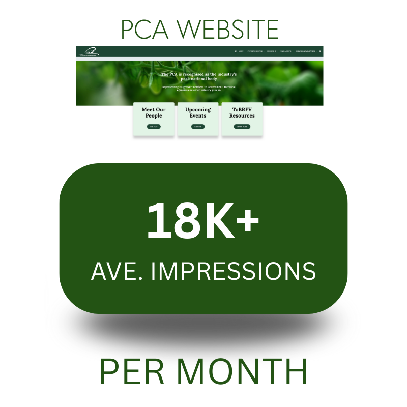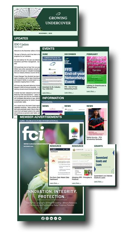 Growing Undercover is PCA’s monthly e-newsletter designed to keep members and subscribers informed about issues relevant to the protected cropping industry. It also includes details of upcoming local, national and international events specifically related to the industry. It is released monthly to members and subscribers via email as a digital publication, and is the perfect vehicle to share your important updates with a highly engaged PC-focused audience.